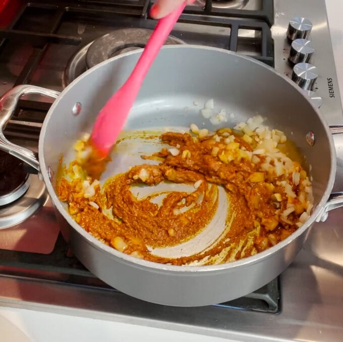 - Add the curry paste and fry for another minute.