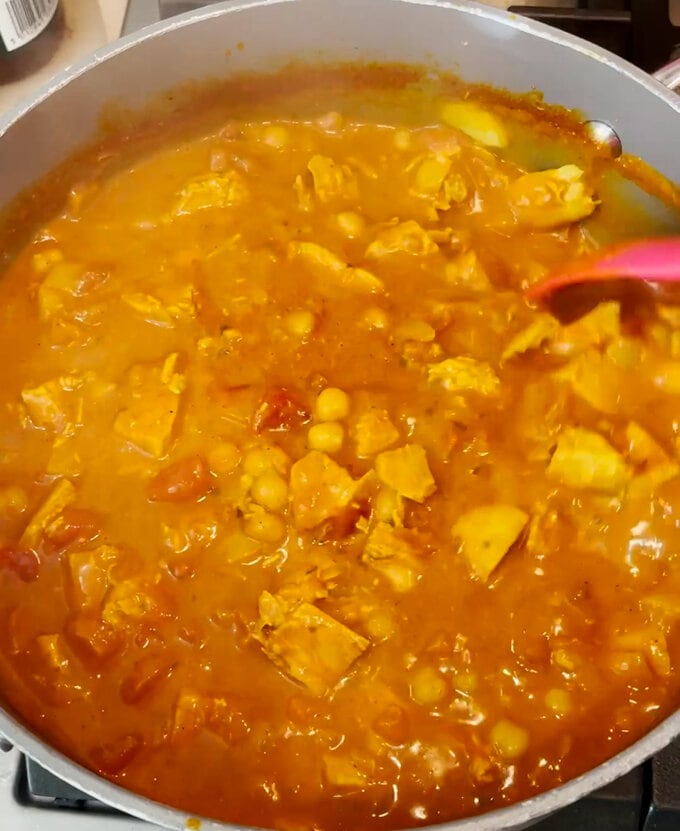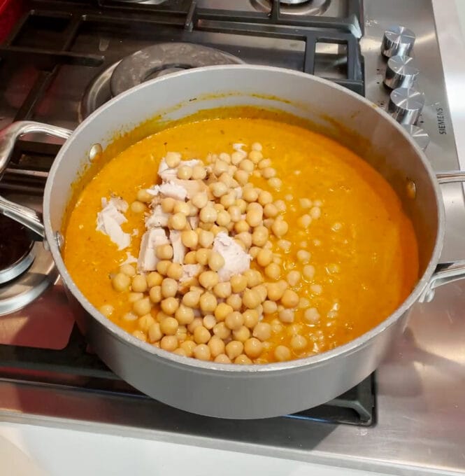 - Add the cooked turkey and drained chickpeas and simmer for a further 10 minutes.